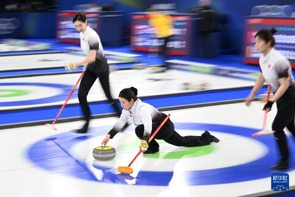 2月15日,中国队选手韩雨(中)在比赛中掷壶。