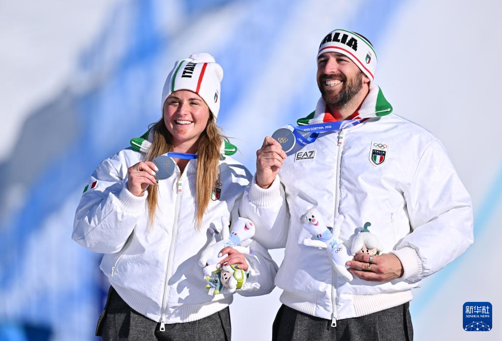 2月15日,亚军意大利1队组合洛伦佐·索马里瓦(右)与搭档米凯拉·莫约利在颁奖仪式上。