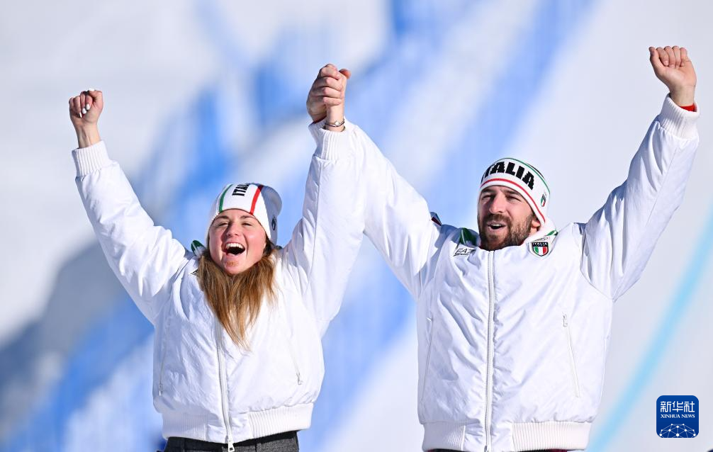 2月15日,冠军英国1队组合休·奈廷格尔(右三)/夏洛特·班克斯(左三),亚军意大利1队组合洛伦佐·索马里瓦(左二)/米凯拉·莫约利(左一),季军法国2队组合洛昂·博佐洛(右一)/莱娅·卡斯塔在颁奖仪式上。