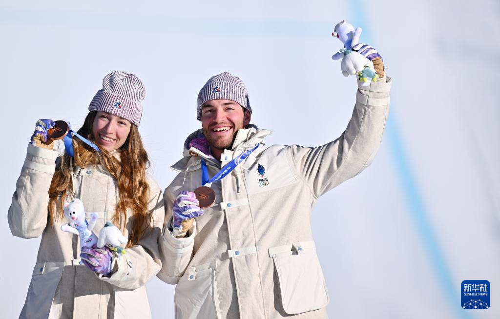 2月15日,季军法国2队组合洛昂·博佐洛(右)与搭档莱娅·卡斯塔在颁奖仪式上。