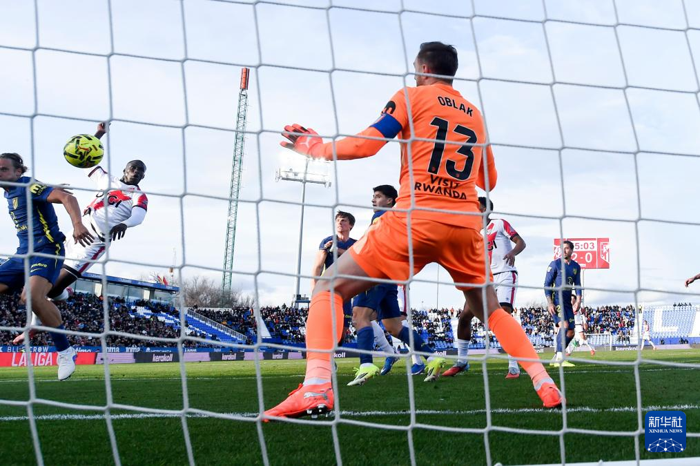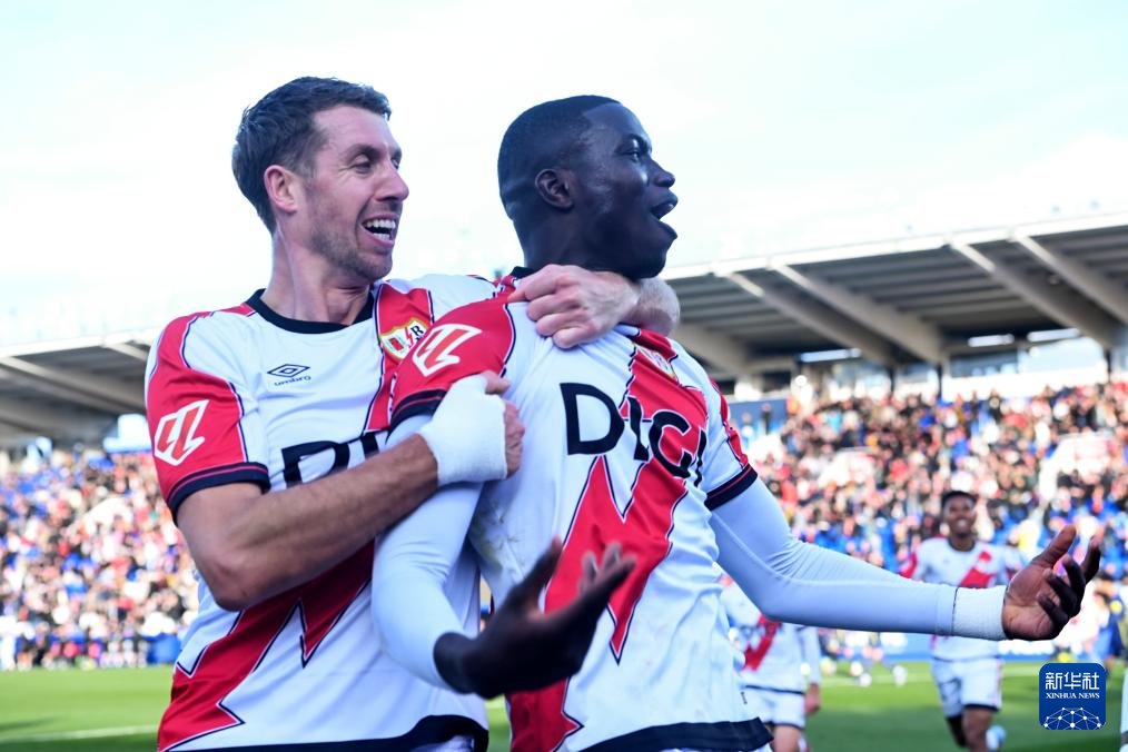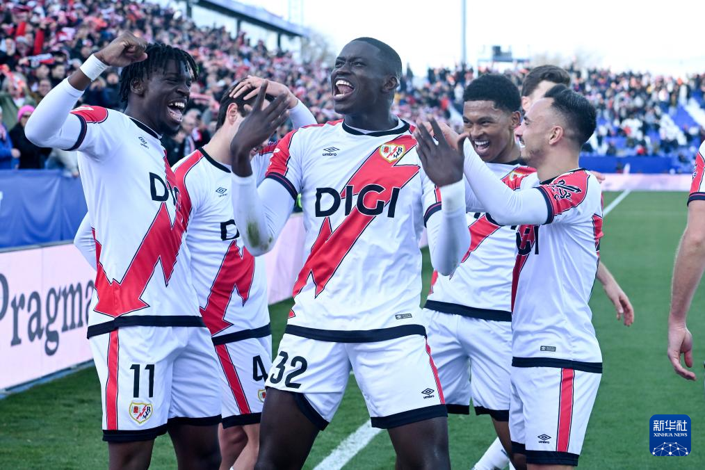 2月15日,巴列卡诺队球员诺贝尔·门迪(左二)在比赛中破门得分。