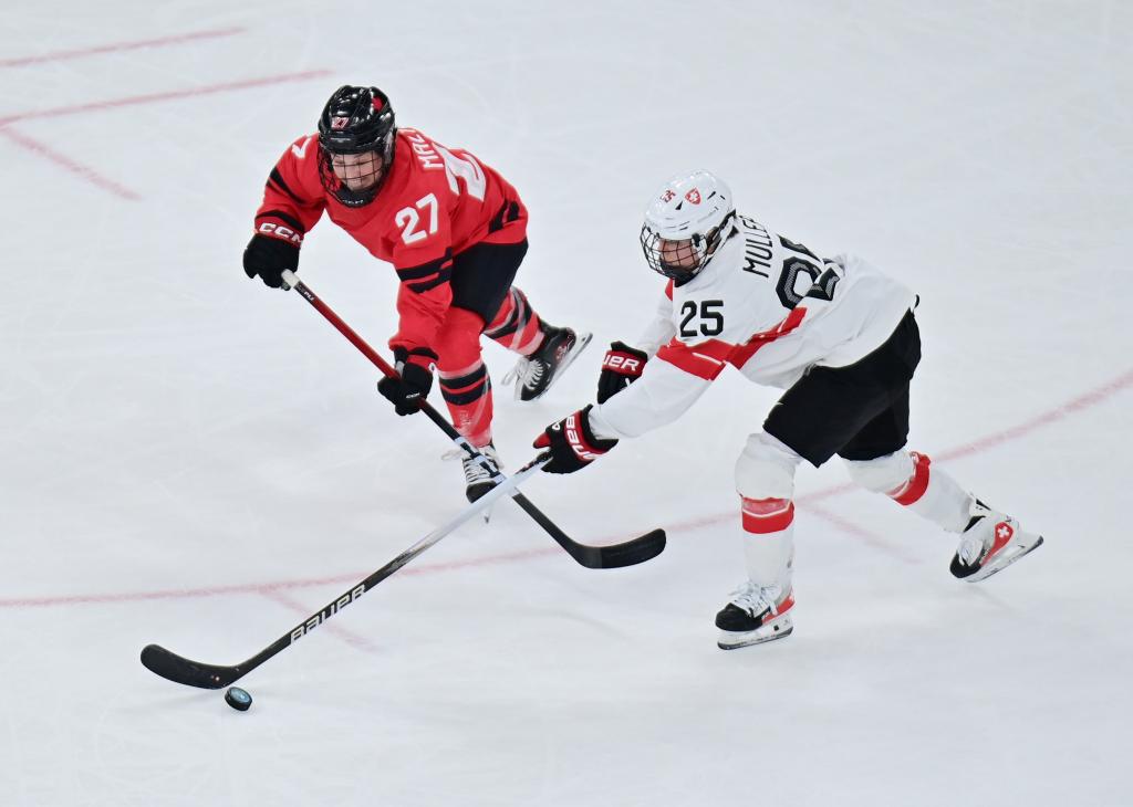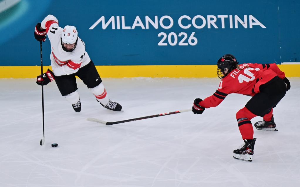 2月16日,加拿大队球员萨拉·菲利尔(右)和瑞士队球员劳拉·齐默尔曼在比赛中拼抢。
