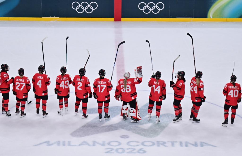 2月16日,加拿大队在赢得比赛后向观众致意。