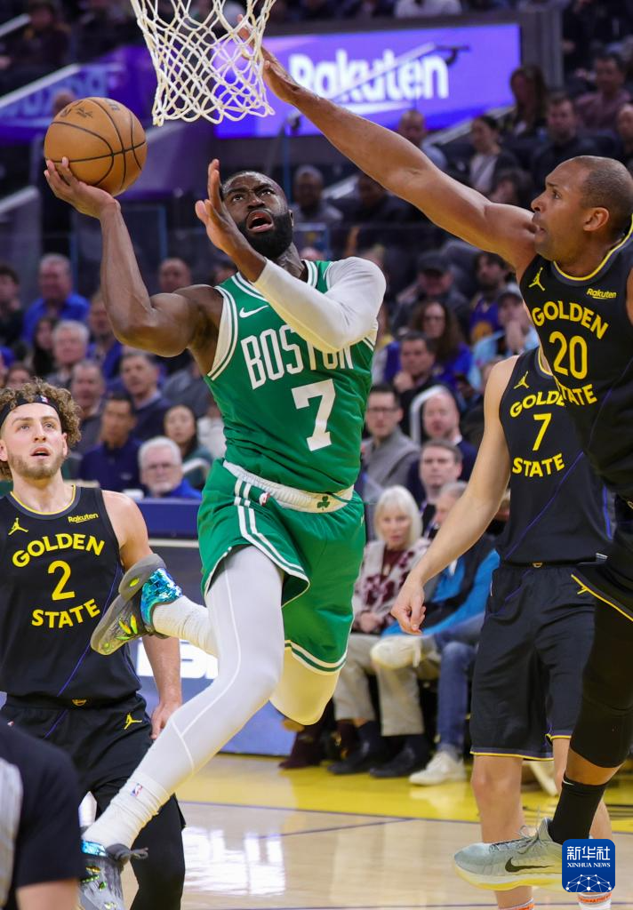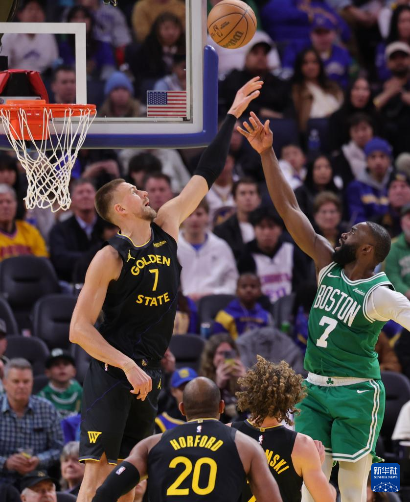 2月19日,勇士队球员波尔津吉斯(左)封盖凯尔特人队球员杰伦·布朗。