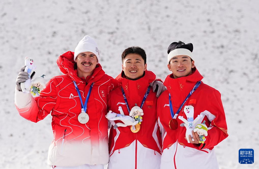 2月20日,冠军中国选手王心迪(中)、亚军瑞士选手罗特(左)和季军中国选手李天马在颁奖仪式上庆祝。