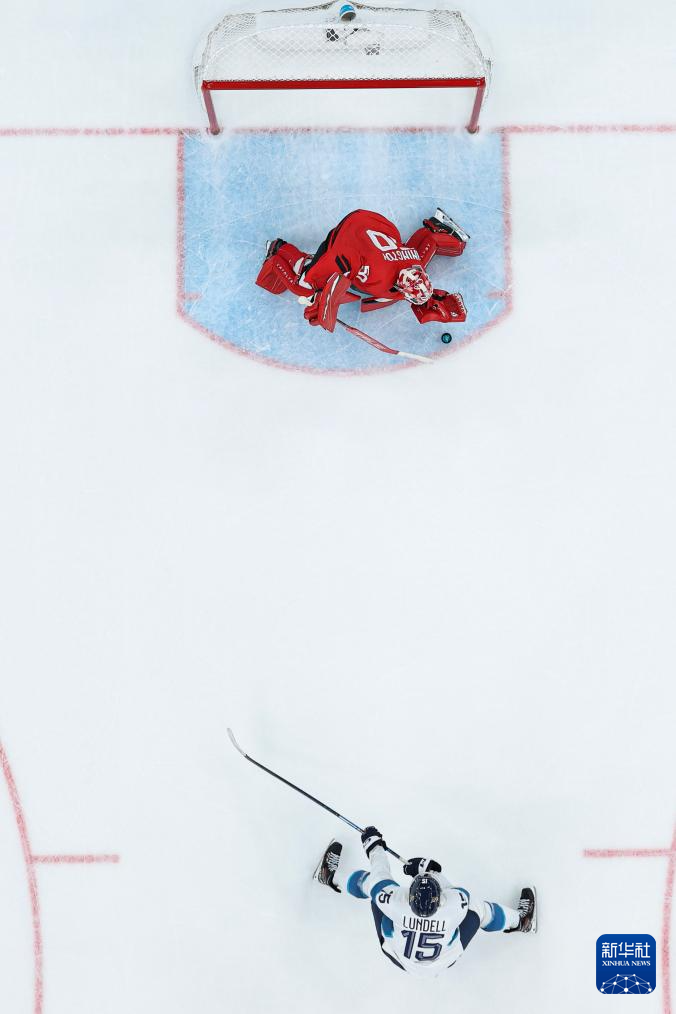 2月20日,芬兰队球员伦德尔(下)在比赛中射门。