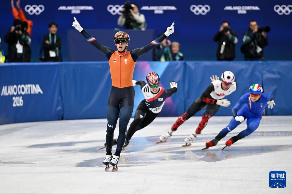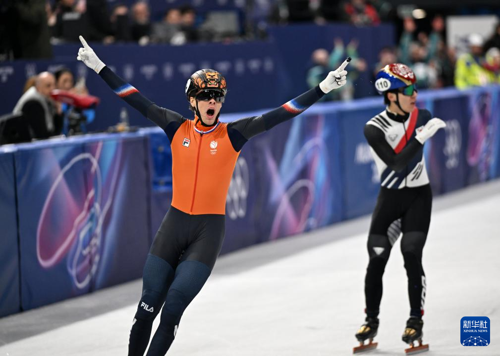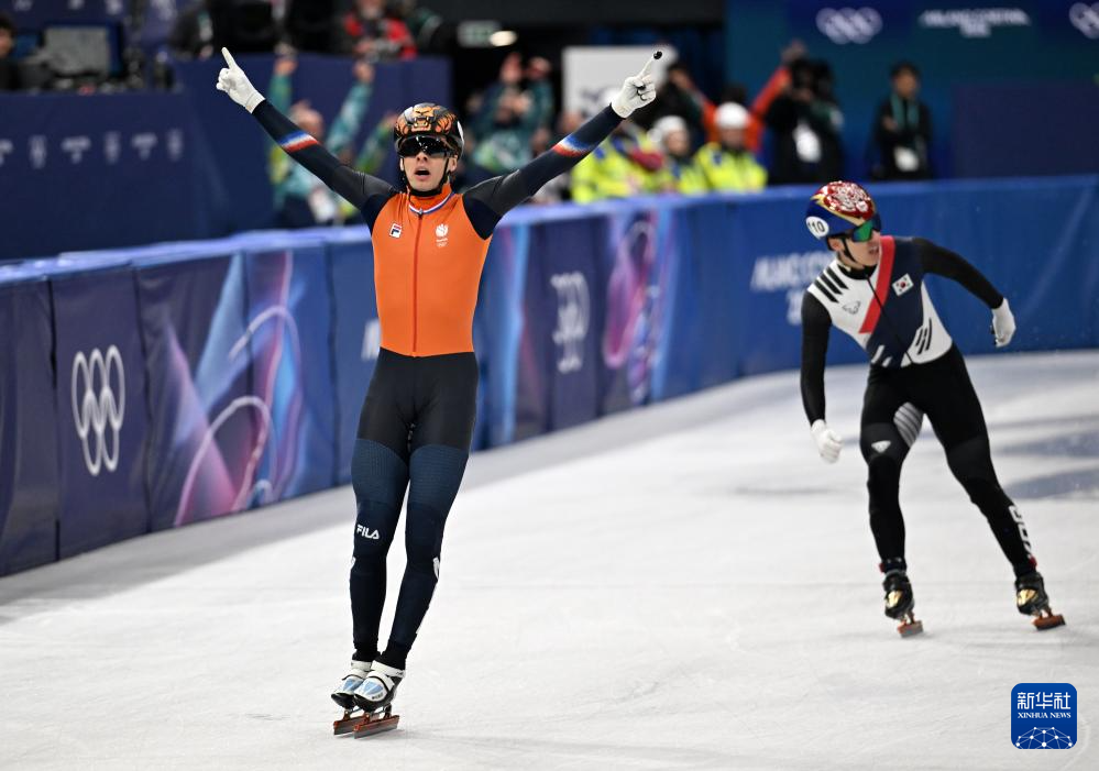 2月20日,荷兰队选手延斯·范特·沃特(前)在冲线后庆祝。