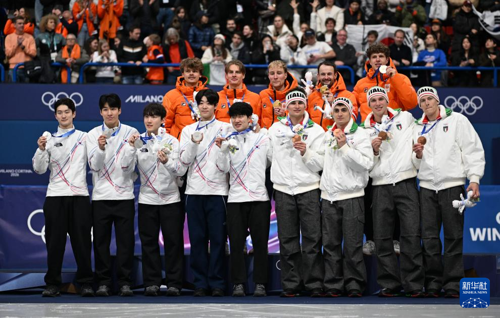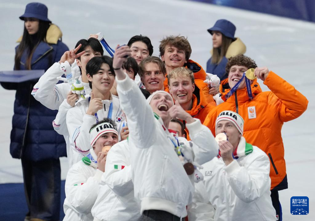 2月20日,冠军荷兰队(后右)、亚军韩国队(后左)和季军意大利队在颁奖仪式上自拍。