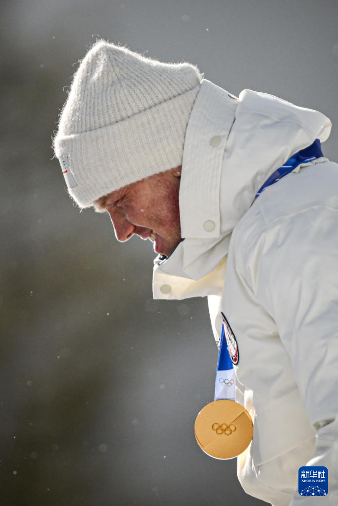 2月20日,亚军挪威选手斯图拉·霍尔姆·莱格雷德在颁奖仪式上庆祝。