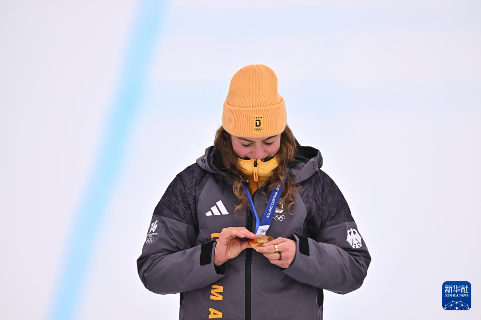 2月20日,冠军德国选手达妮埃拉·迈尔在颁奖仪式上。