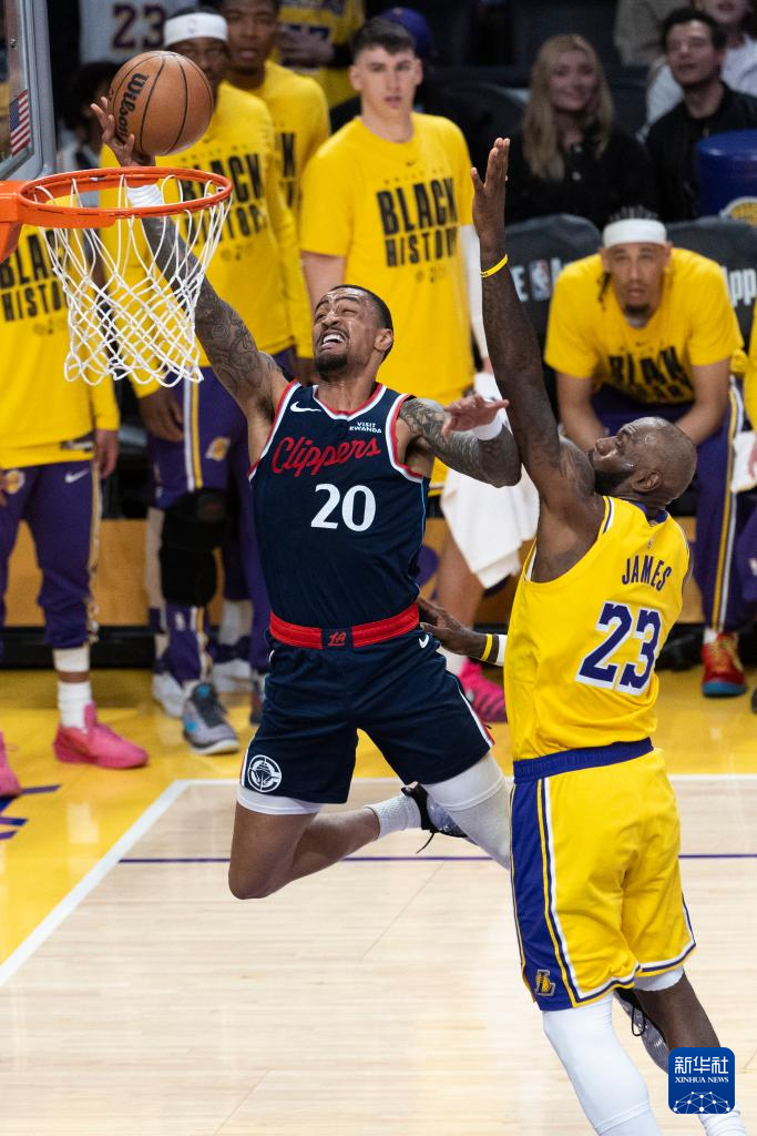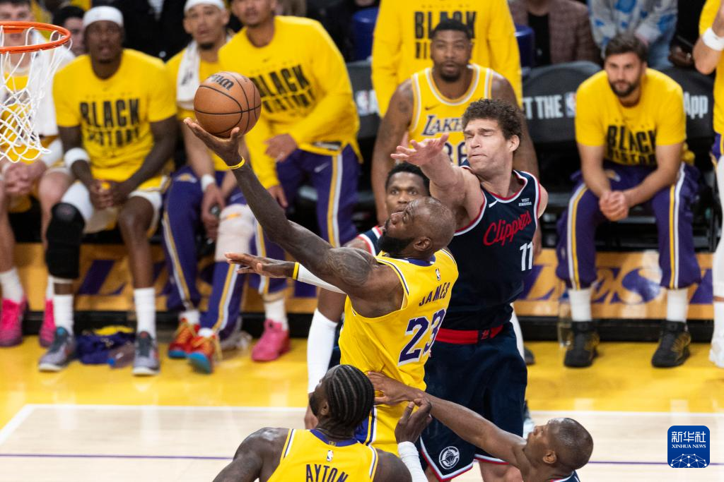2月20日,湖人队球员詹姆斯 (中)在比赛中上篮。