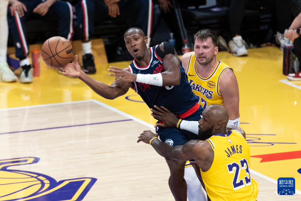 2月20日,快船队球员科林斯(左) 在湖人队球员詹姆斯的防守下上篮。