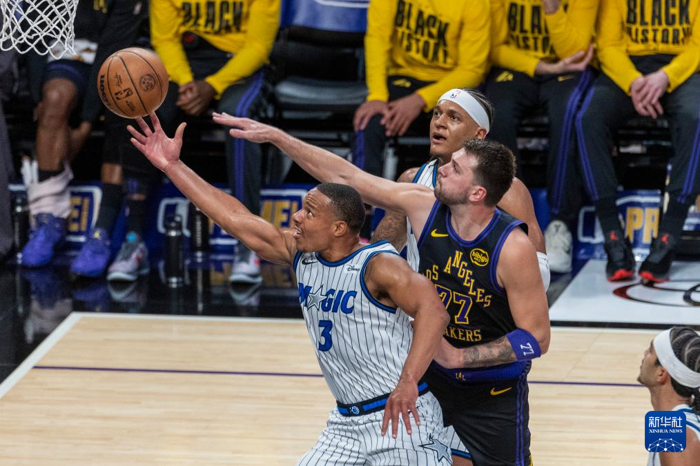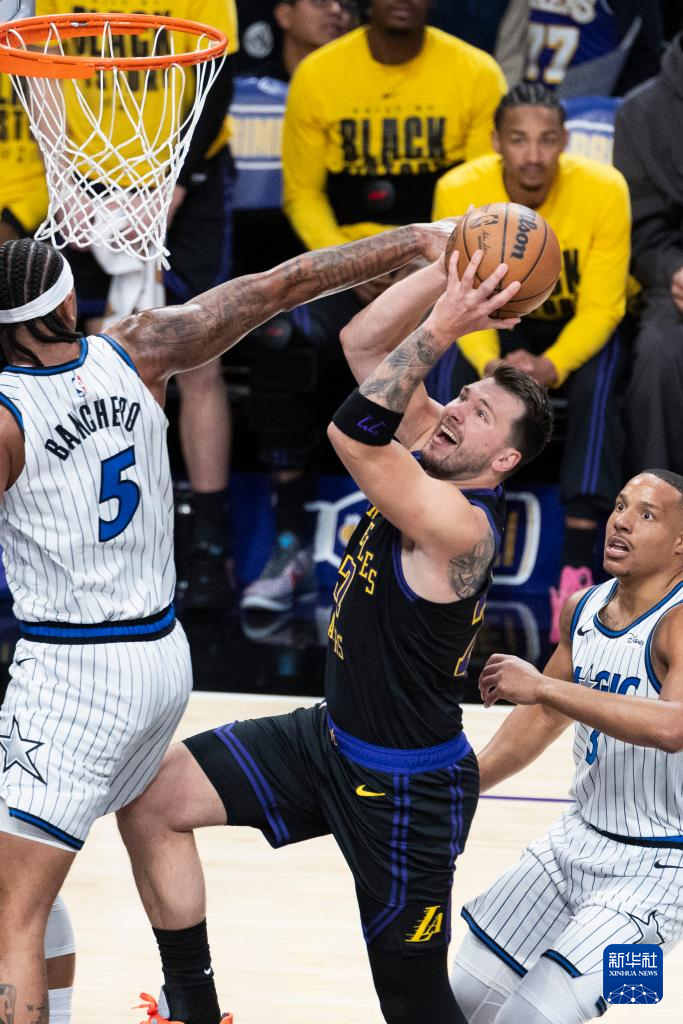 2月24日,湖人队球员卢卡·东契奇(中)在比赛中上篮受阻。