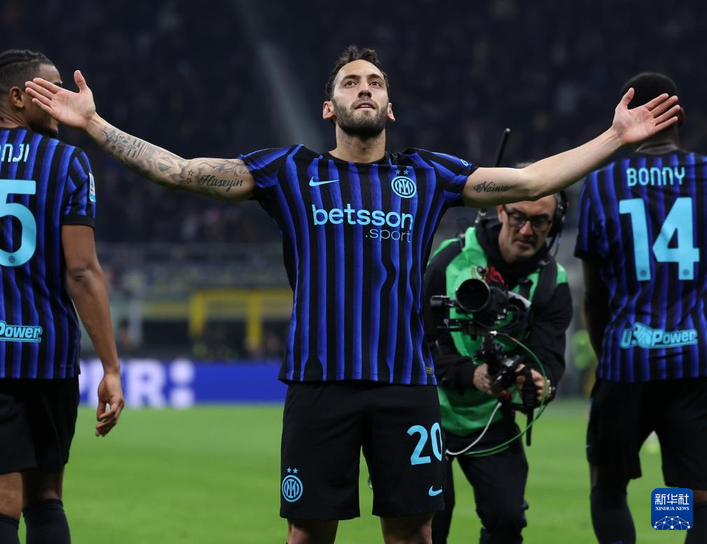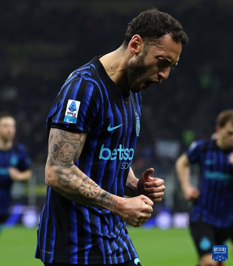 2月28日,国际米兰队球员恰尔汗奥卢在比赛中庆祝进球。