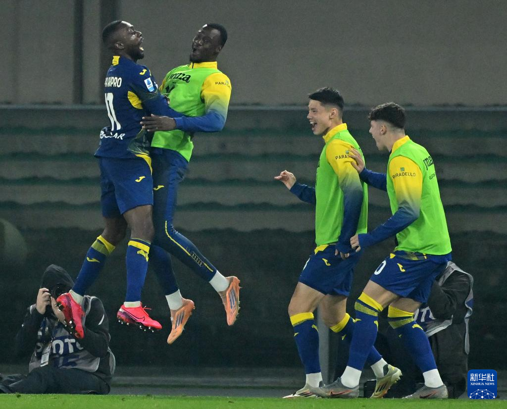 2月28日,维罗纳队球员阿克普洛(左一)与队友庆祝进球。