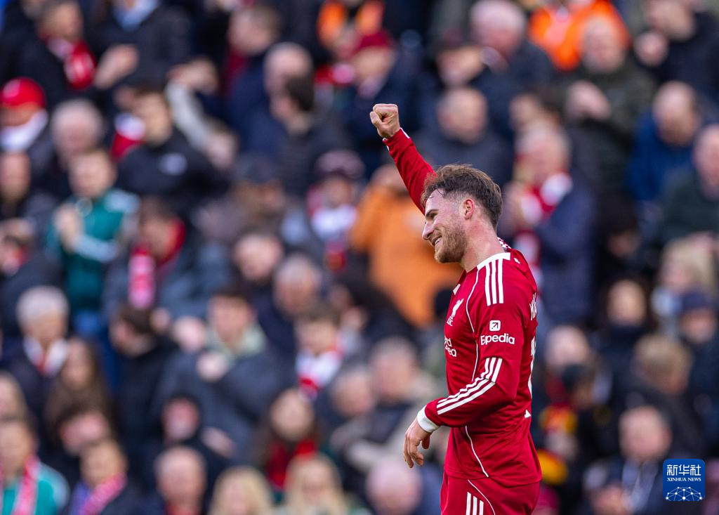 2月28日,利物浦队球员麦卡利斯特在比赛中庆祝进球。