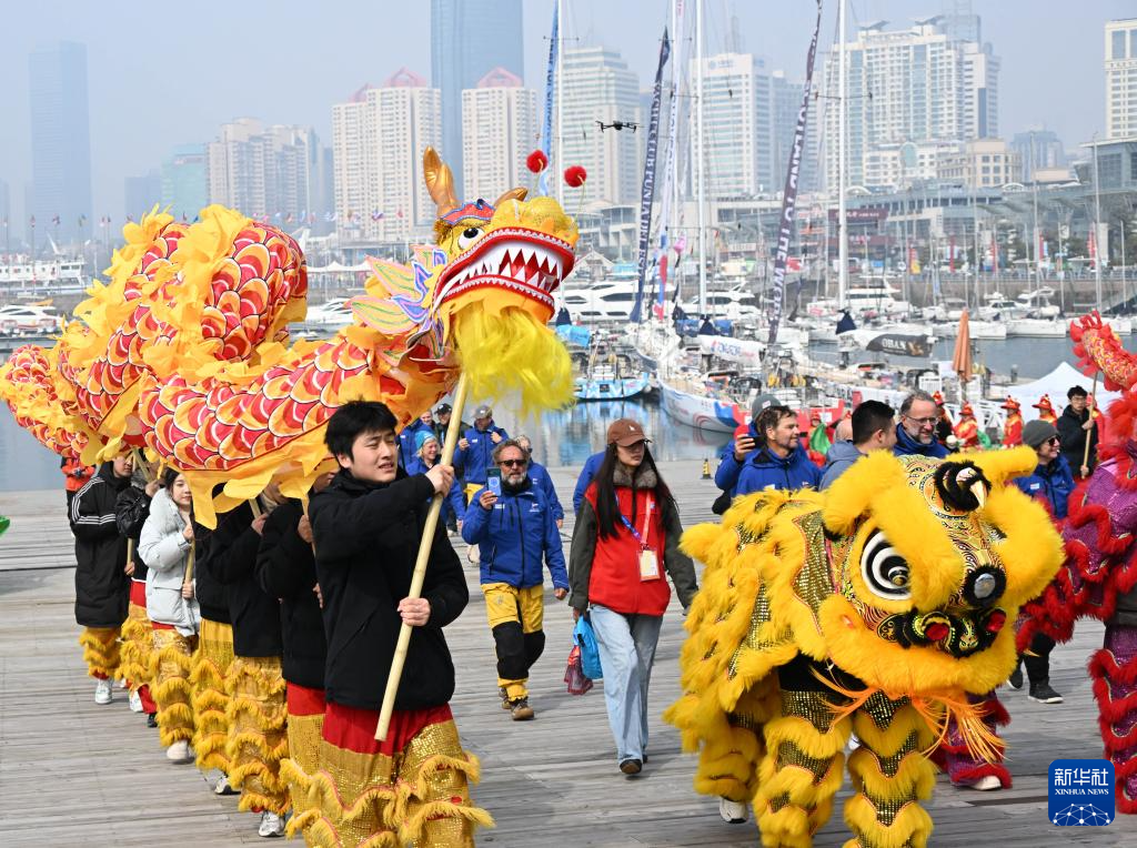 3月4日,舞狮队、舞龙队在青岛奥林匹克帆船中心码头表演,欢迎船队抵达。