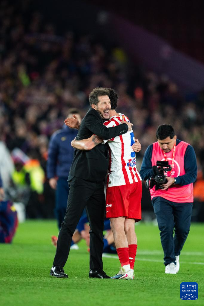 3月3日,马德里竞技队主教练西蒙尼和球员在赛后庆祝晋级。