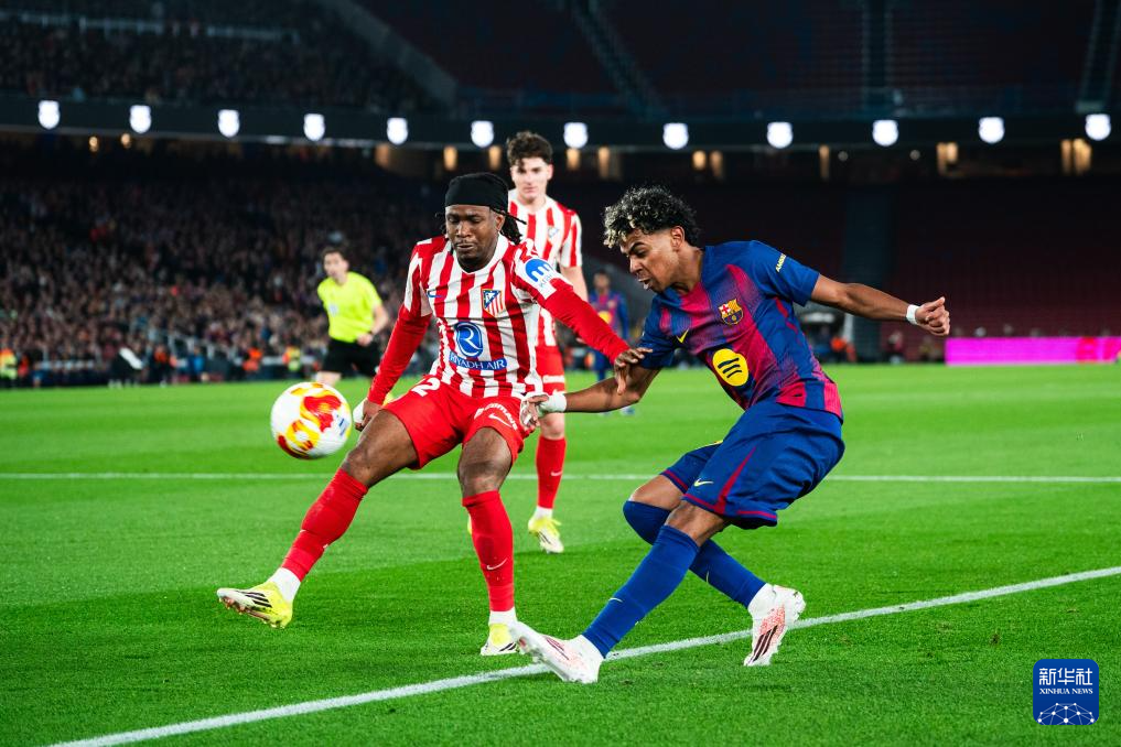 3月3日,巴塞罗那队球员亚马尔(右)与马德里竞技队球员卢克曼在比赛中拼抢。
