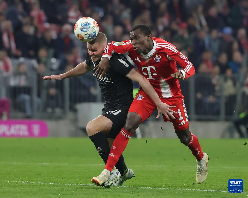 3月6日,拜仁慕尼黑队球员雅克松(右)在比赛中射门得分。