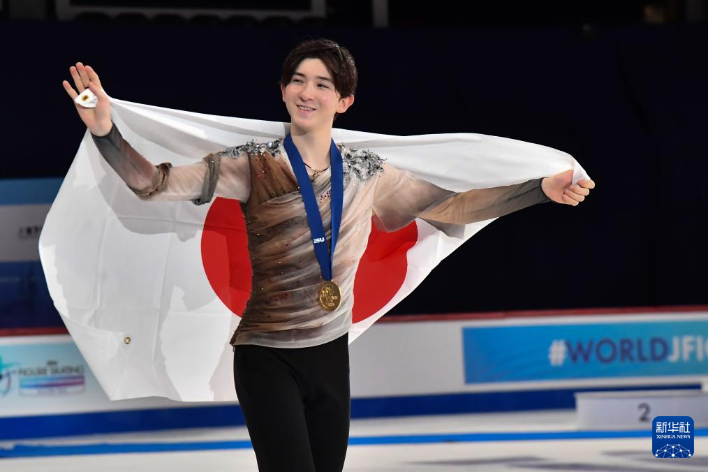 3月6日,男子单人滑冠军日本选手中田璃士在颁奖仪式后庆祝。