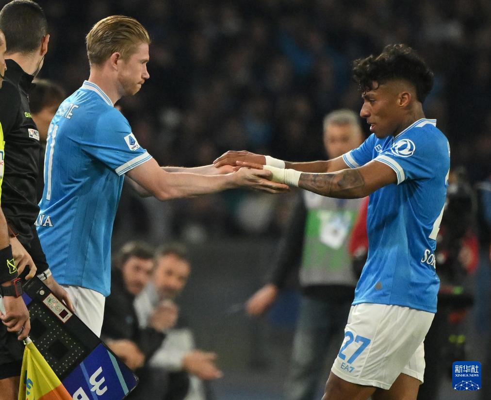 3月6日,那不勒斯队球员德布劳内(左)换下队友阿利松·桑托斯。
