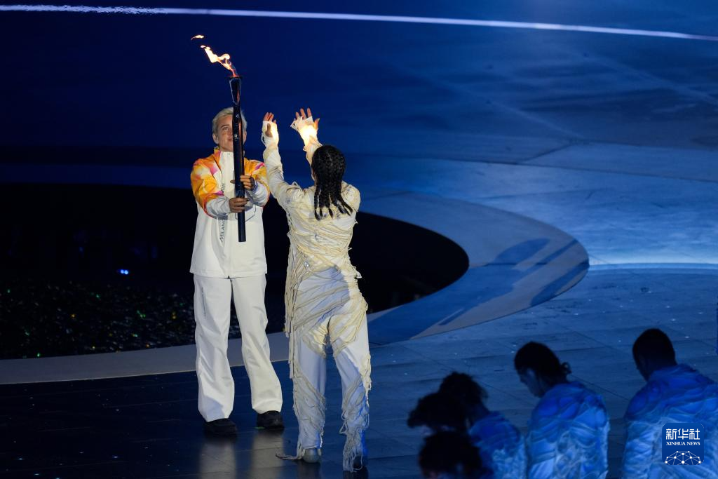 3月6日,火炬手贝贝·维奥(上)手持火炬在开幕式上。