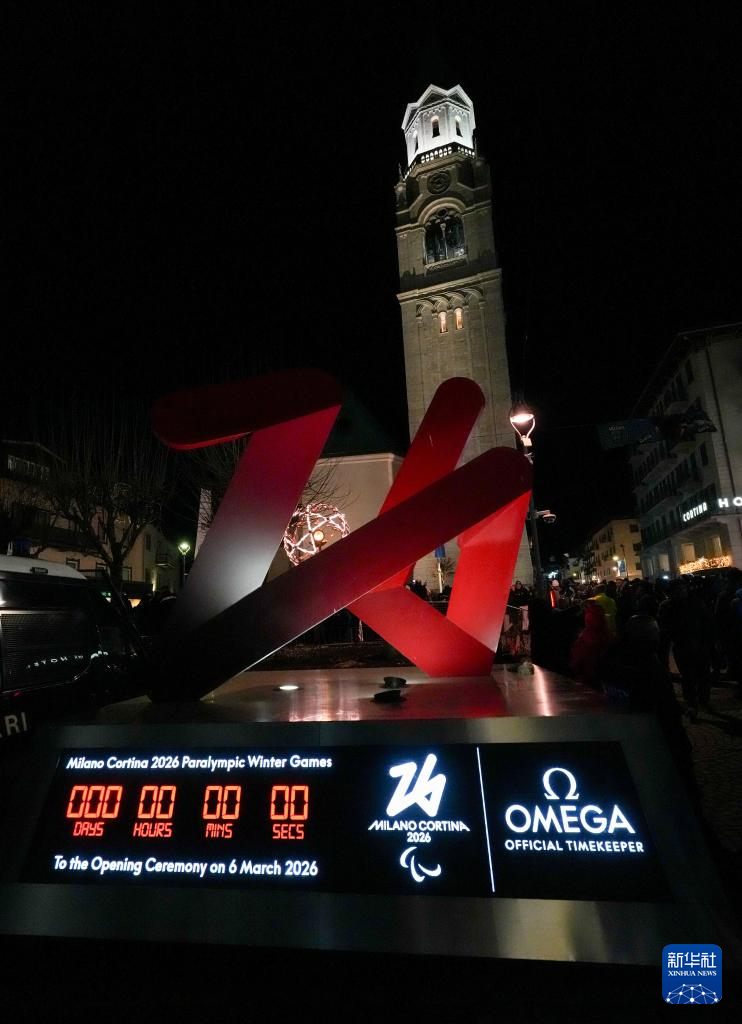 这是3月6日在科尔蒂纳迪博纳广场拍摄的冬残奥会火炬和倒计时钟。