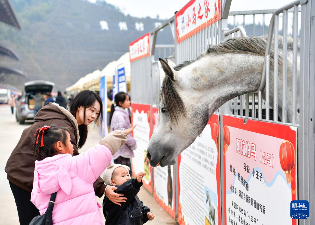 3月7日,孩子们在贵州省三都水族自治县“村马”比赛现场与马匹互动。