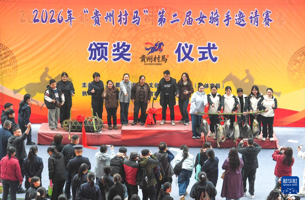 3月7日拍摄的2026年贵州“村马”第二届女骑手邀请赛颁奖仪式现场,活动奖品是黑毛猪、黑山羊、本地鹅等。