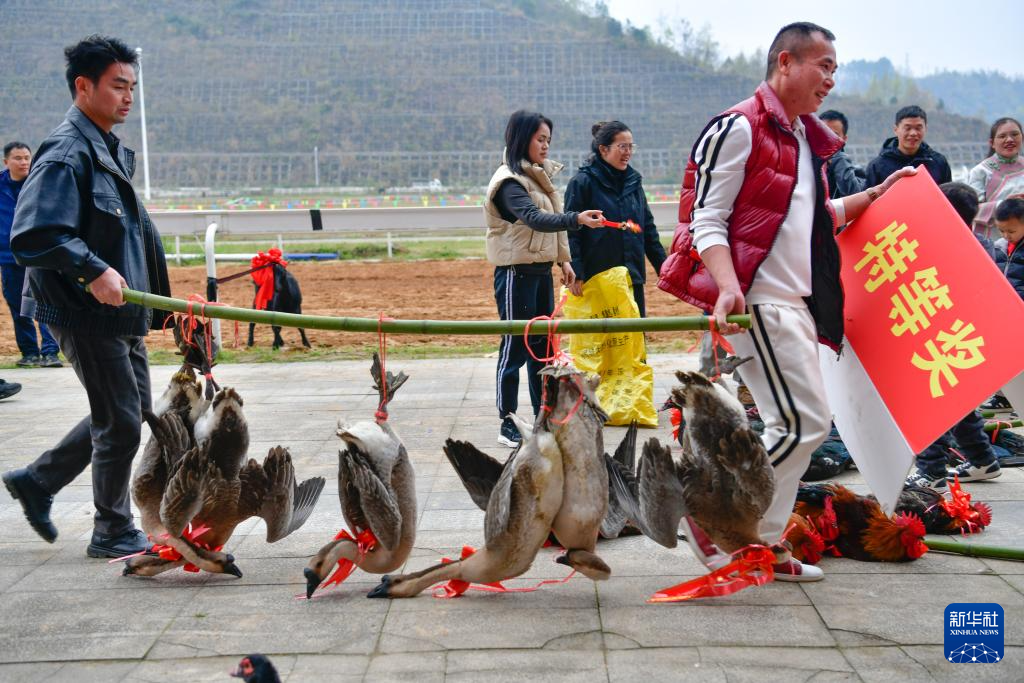 3月7日,工作人员在贵州省三都水族自治县“村马”比赛现场搬运活动奖品——鹅。