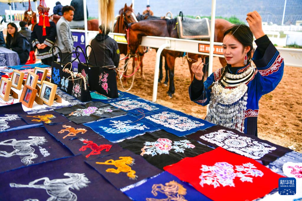 3月7日,绣娘在贵州省三都水族自治县“村马”比赛现场展示马尾绣。