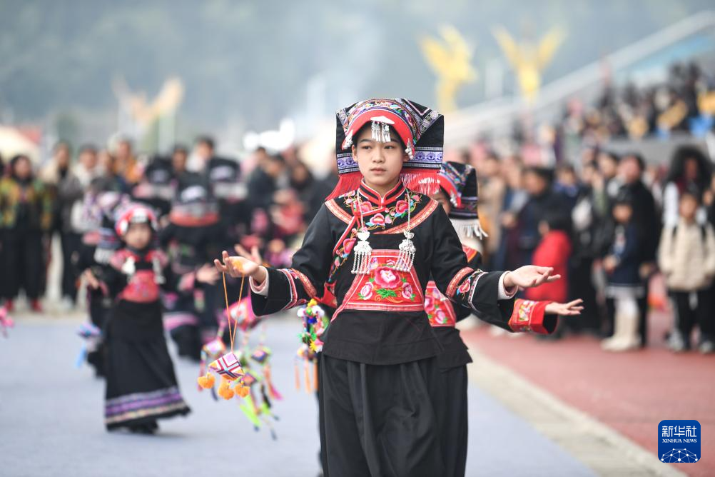 3月7日,孩子们在贵州省三都水族自治县“村马”比赛现场进行民族服饰展演。