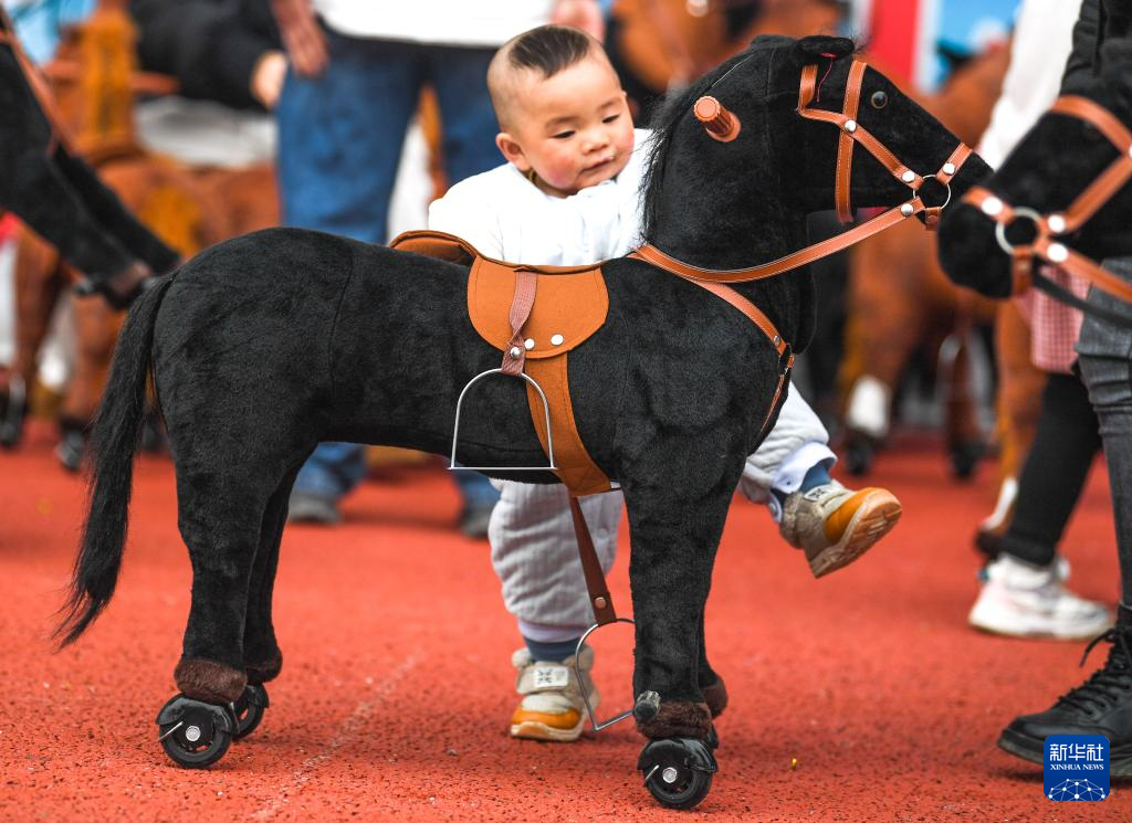 3月7日,小朋友在贵州省三都水族自治县“村马”比赛现场试骑玩偶马。