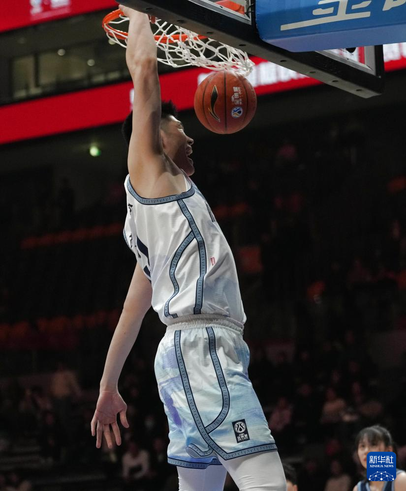 3月7日,海纳百川队球员胡金秋在比赛中扣篮。