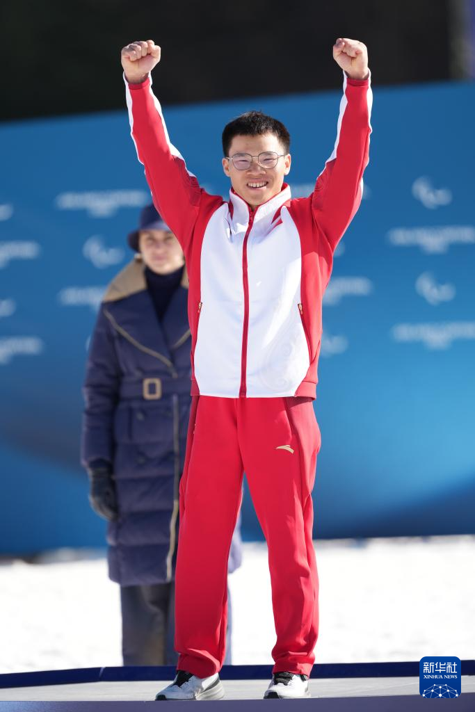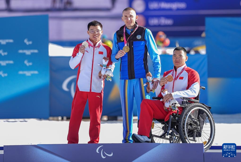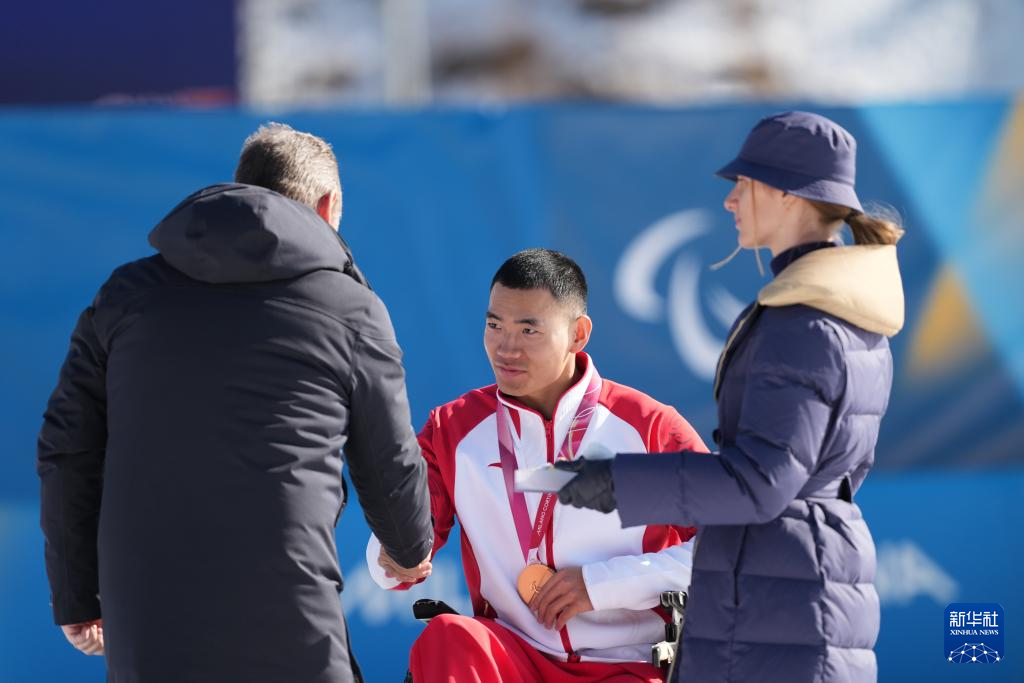3月7日,国际残奥委会主席安德鲁·帕森斯(左)为季军中国选手刘子旭(中)颁奖。