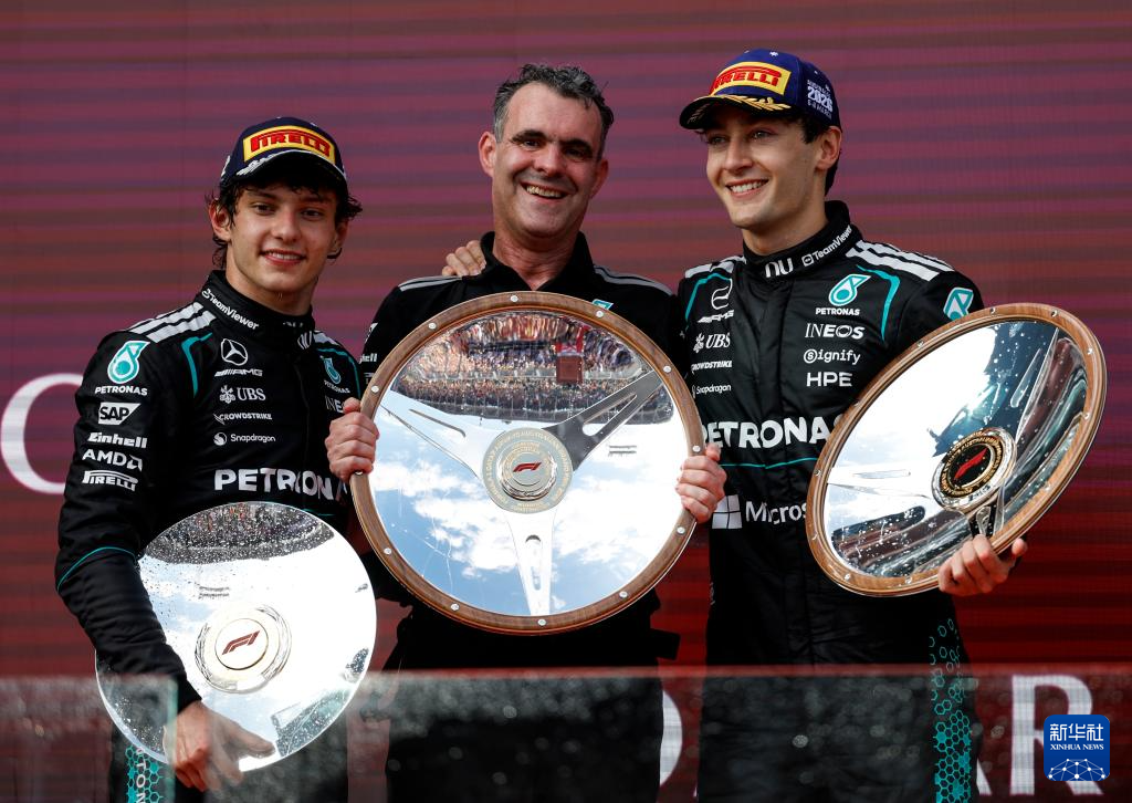 3月8日,冠军梅赛德斯车队英国车手拉塞尔(右)和亚军梅赛德斯车队意大利车手安东内利(左)在颁奖典礼上合影。
