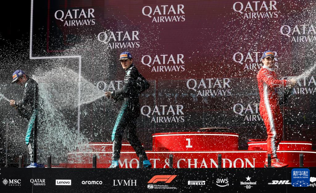 3月8日,冠军梅赛德斯车队英国车手拉塞尔(中)、亚军梅赛德斯车队意大利车手安东内利(左)和季军法拉利车队摩纳哥车手勒克莱尔在颁奖典礼上开香槟庆祝。