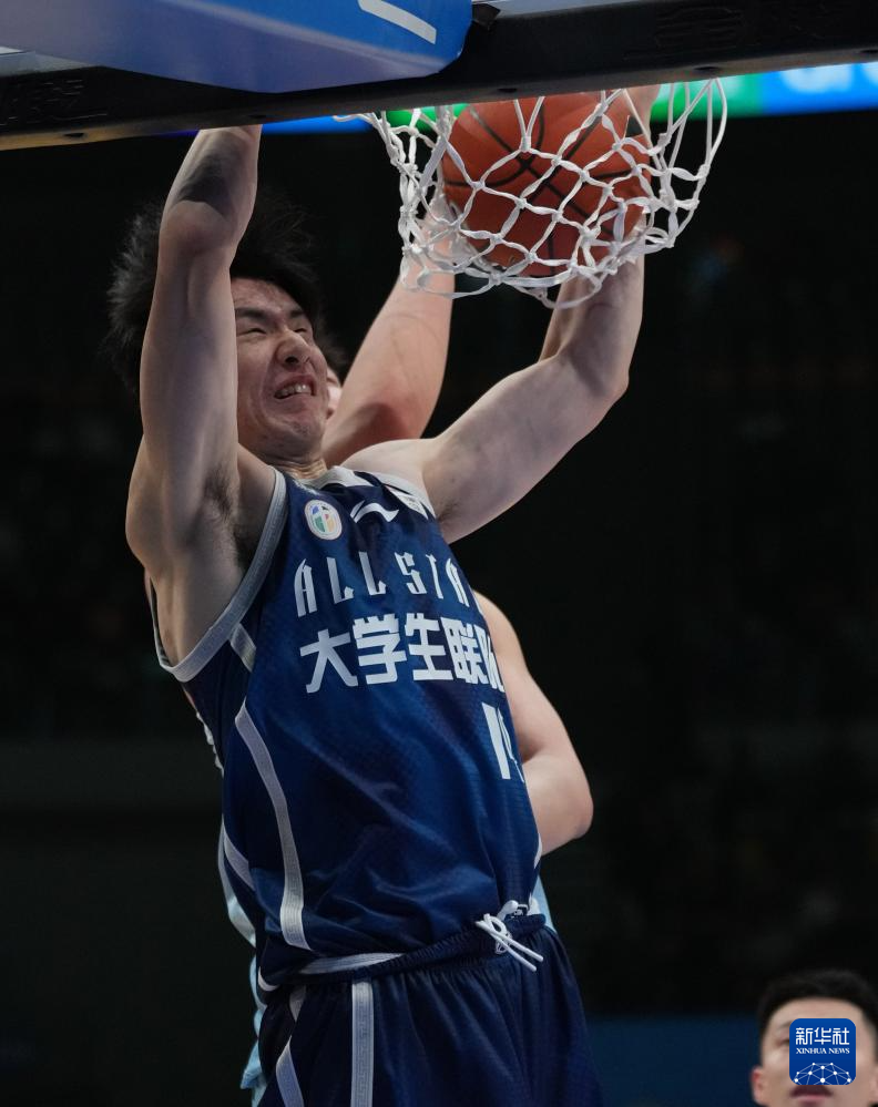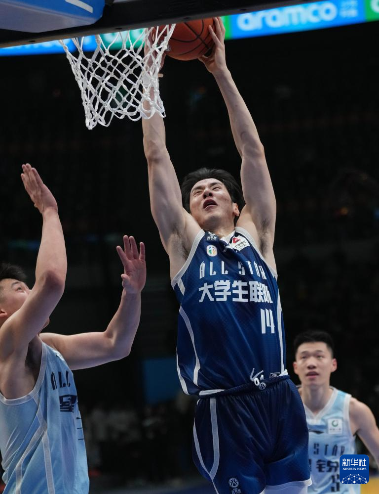 3月7日,大学生联队球员王浩霖(前)在比赛中扣篮。