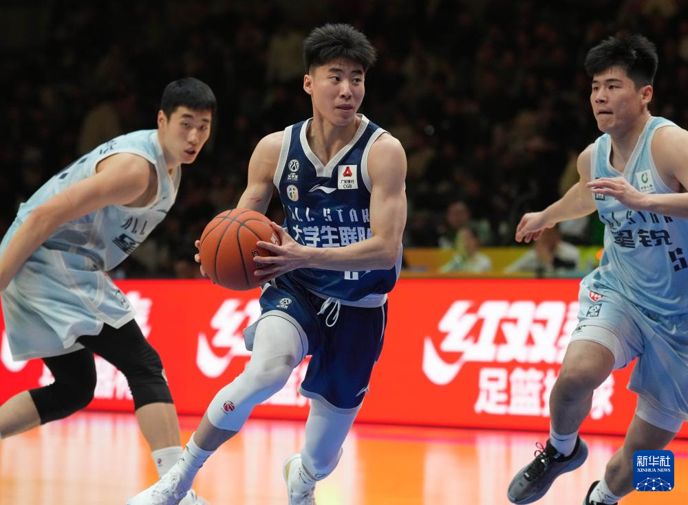 3月7日,大学生联队球员曹芷豪(中)在比赛中突破。