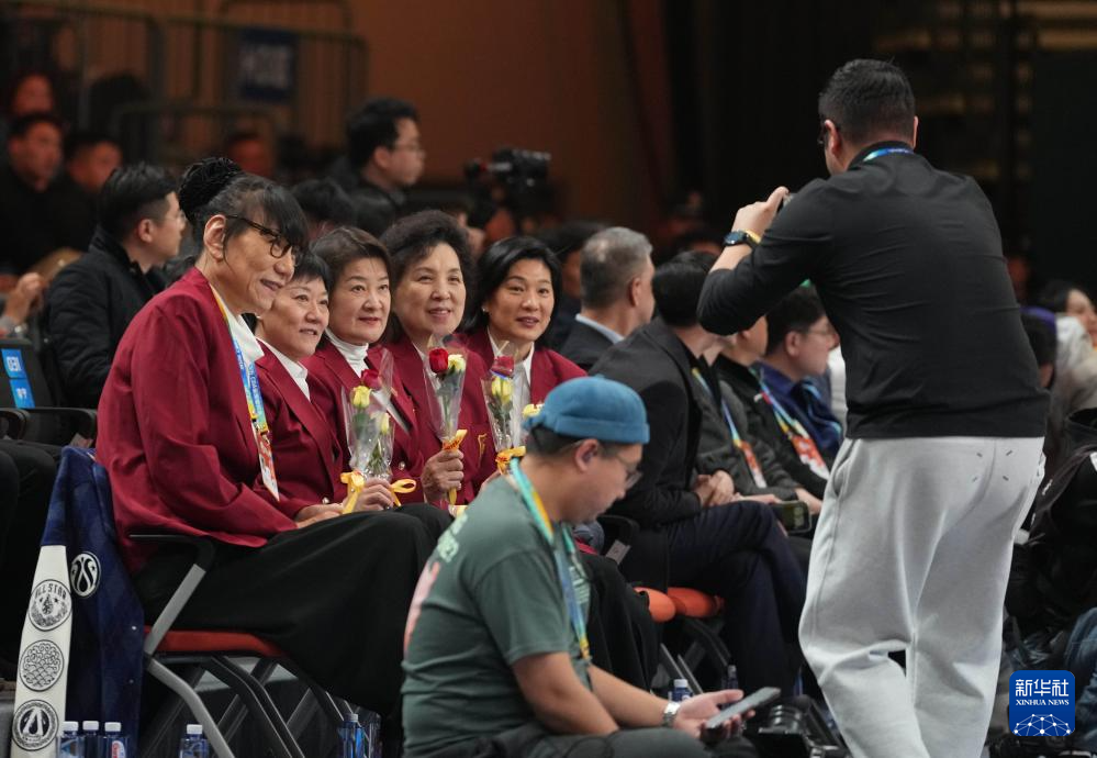 3月7日,在场边观赛的中国篮球名人堂成员郑海霞(左一)等在接受献花后合影。