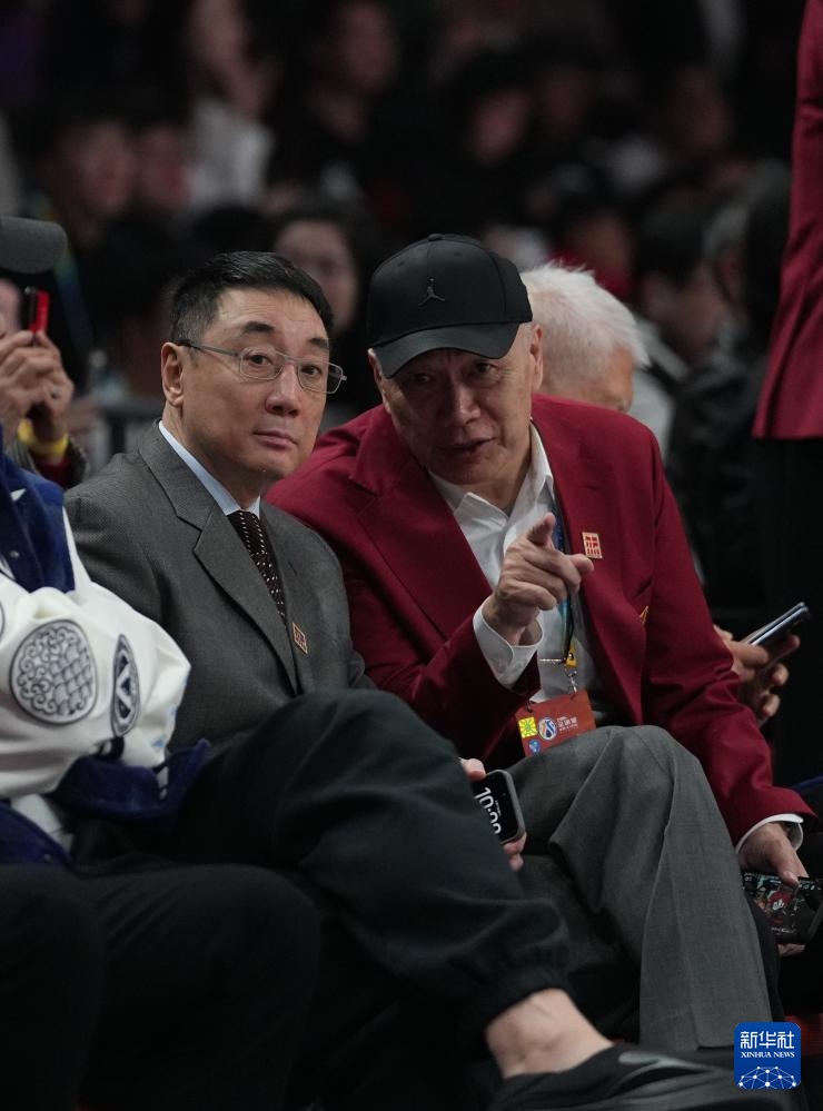 3月7日,中国篮球名人堂成员匡鲁彬(右)、王非在场边观赛。