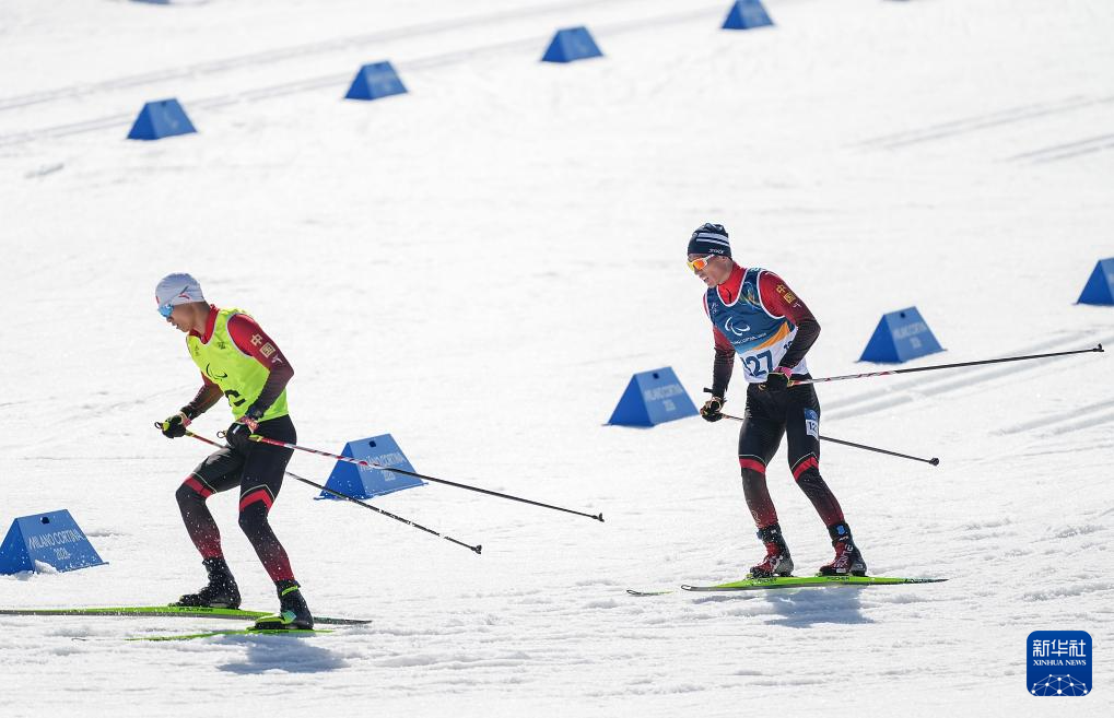 3月7日,中国选手党鹤松(右)与引导员卢宏达在比赛中。