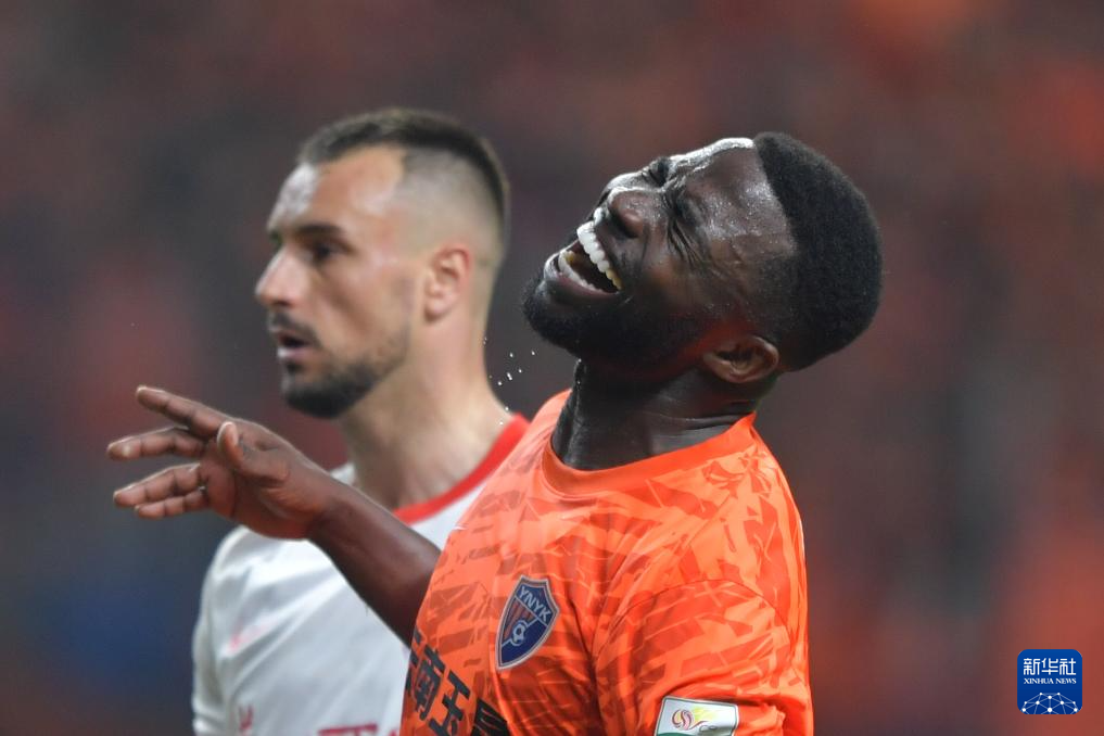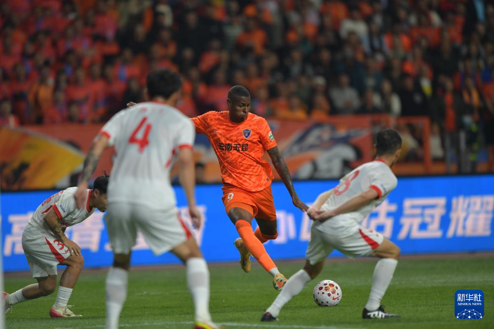 3月7日,云南玉昆队球员克莱伯(右二)在比赛中射门。