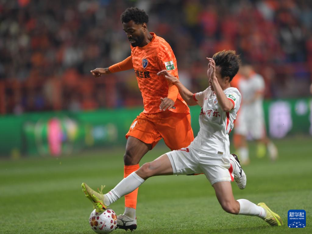 3月7日,青岛海牛队球员叶博亚(右一)在比赛中射门得分。