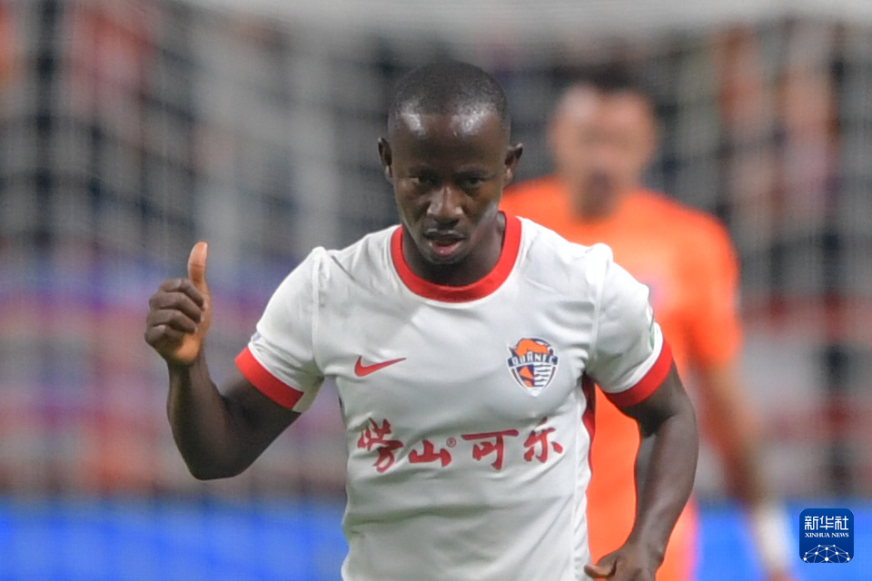 3月7日,青岛海牛队球员叶博亚在比赛中庆祝进球。