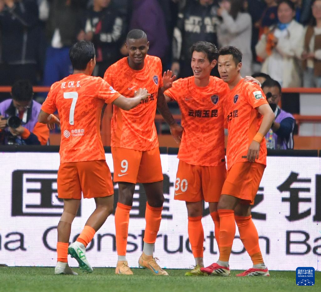 3月7日,云南玉昆队球员在比赛中庆祝进球。