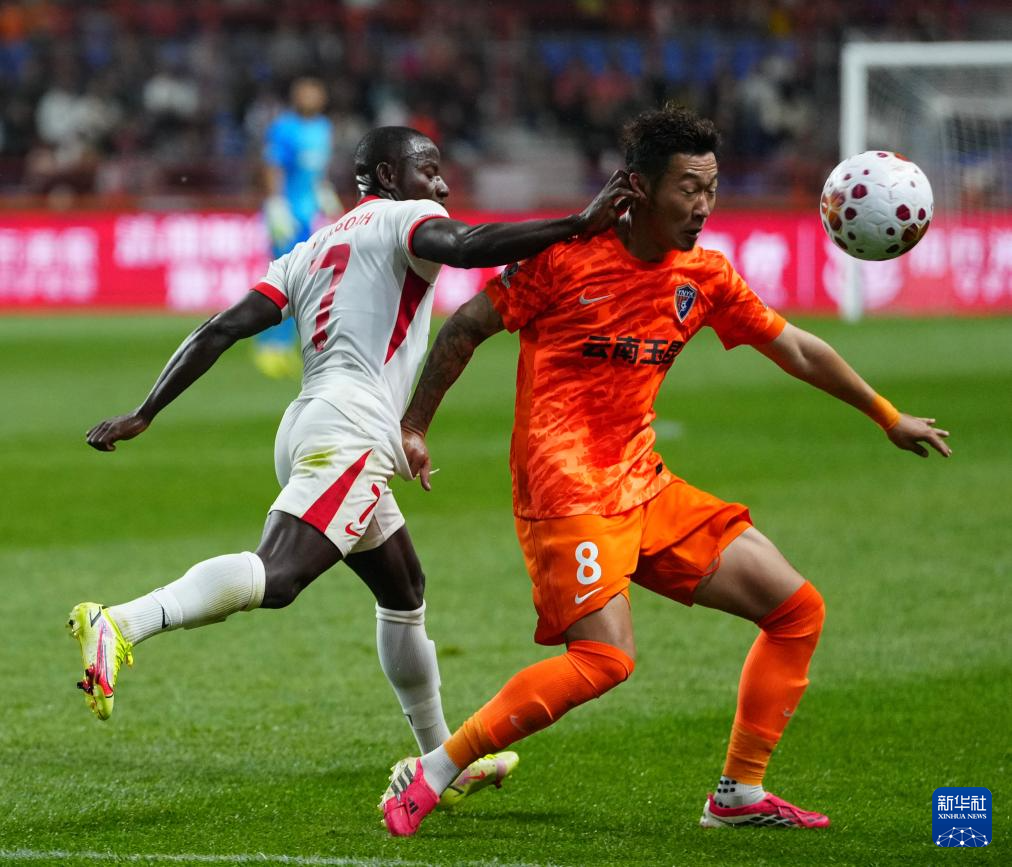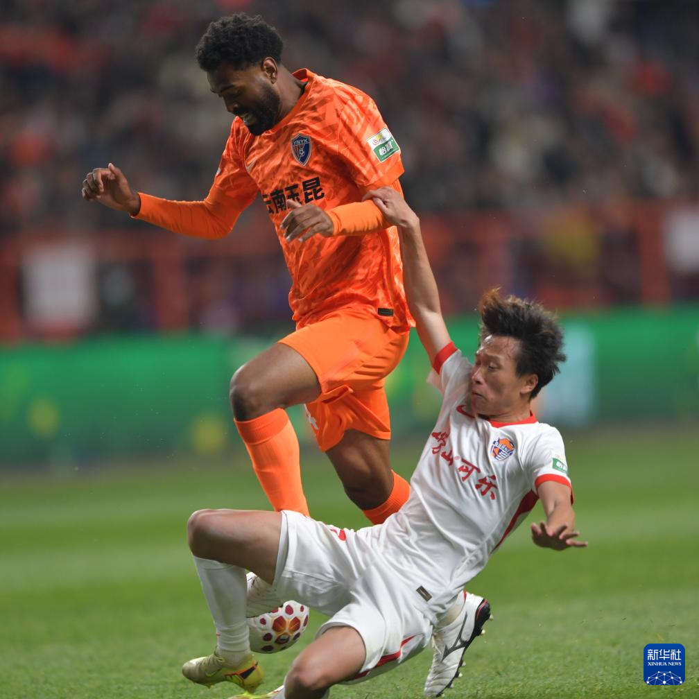 3月7日,云南玉昆队球员卡约(左)与青岛海牛队球员韦子弦在比赛中拼抢。