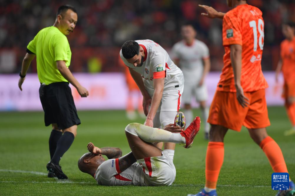 3月7日,青岛海牛队球员斯特兰德贝里(下)在比赛中摔倒。