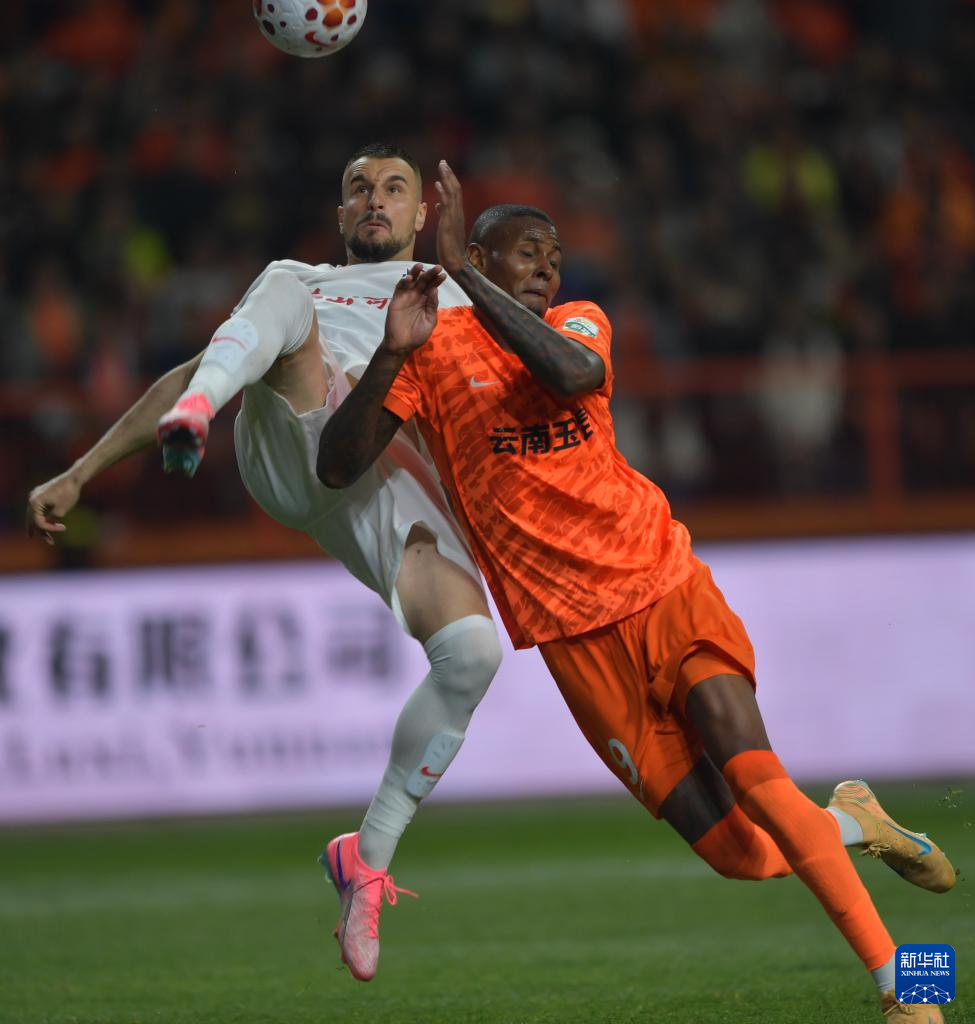 3月7日,云南玉昆队球员克莱伯(右)与青岛海牛队球员安杰尔科维奇在比赛中拼抢。